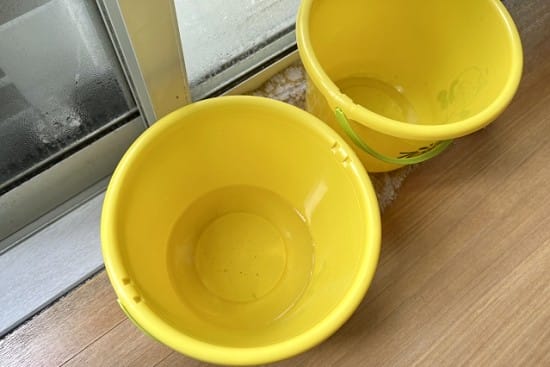 水が落ちてくる場所にバケツやビニールシートを設置して、床や家具への被害を防ぎます。水滴の範囲が広い場合は新聞紙でカバーを。 -
